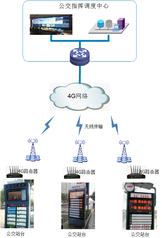 在公交站台部署电子站牌、显示控制终端和4G无线路由器,4G无线路由器通过4G链路接入公交专网;