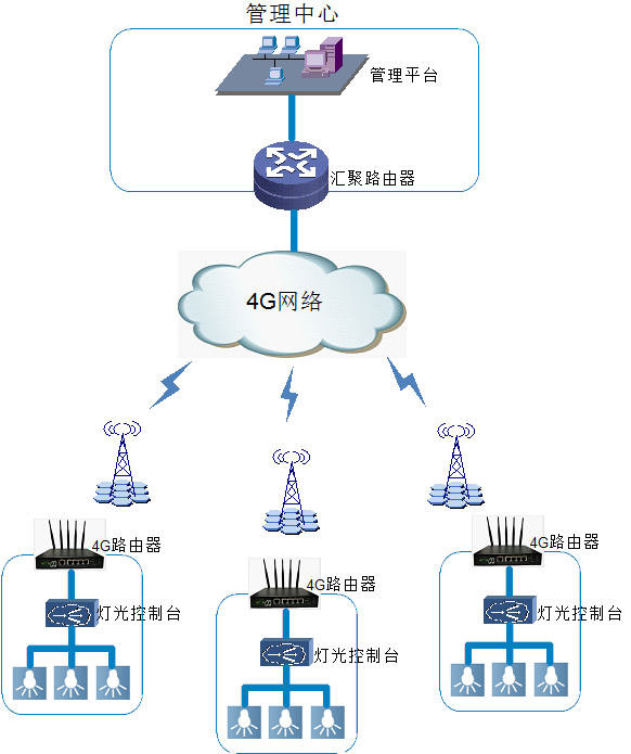 4G无线路由器连接分支灯光控制台,通过无线链路联通灯光控制台与管理中心,实现管理中心远程对灯光系统的控制,例如灯光开关、灯源色彩、亮度强弱等控制。