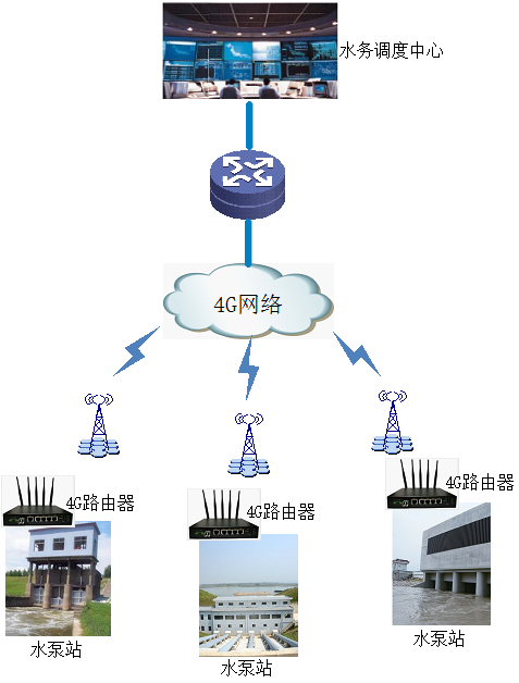 水泵站控制终端将水泵站数据通过4G路由器,接入运营商4G网络,传至自来水厂的供水调度中心服务器。