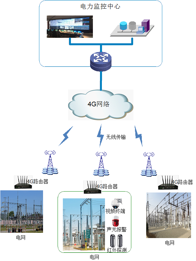 在各监控点部署4G无线路由器,将监控点的视频数据、动环数据(例如红外、声光报警、电力数据、温湿度数据)接入4G路由器,通过4G链路,将数据传输至电力监控中心,实现远程监控管理。